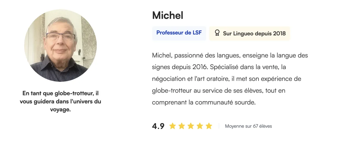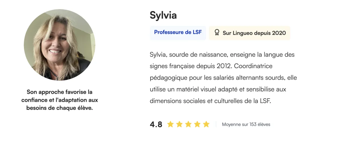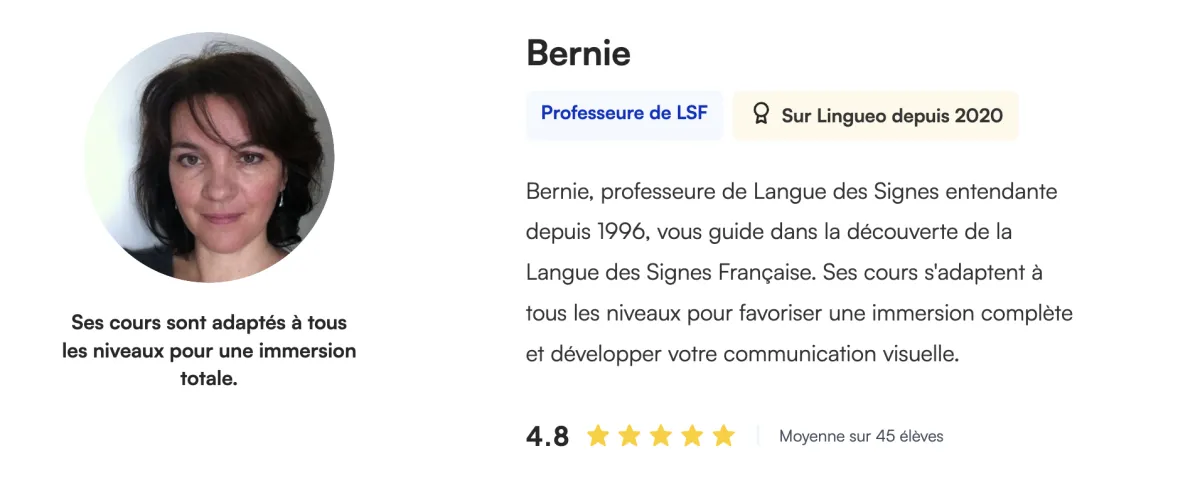 Les professeurs sont des experts en Langue des Signes, sourds ou entendants, certifiés et expérimentés. Vous pouvez consulter leurs profils, leurs qualifications et les avis des élèves pour choisir celui qui vous convient.